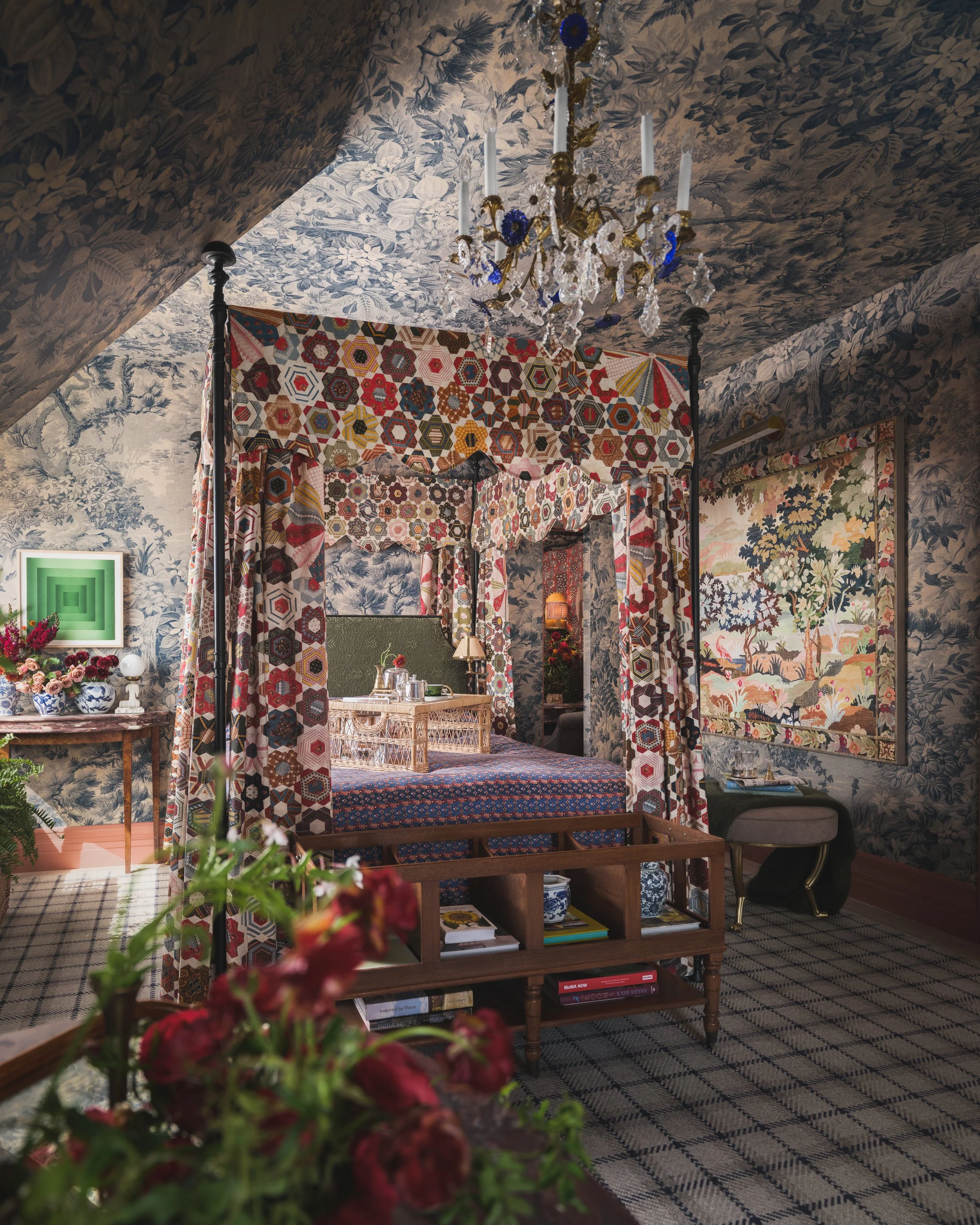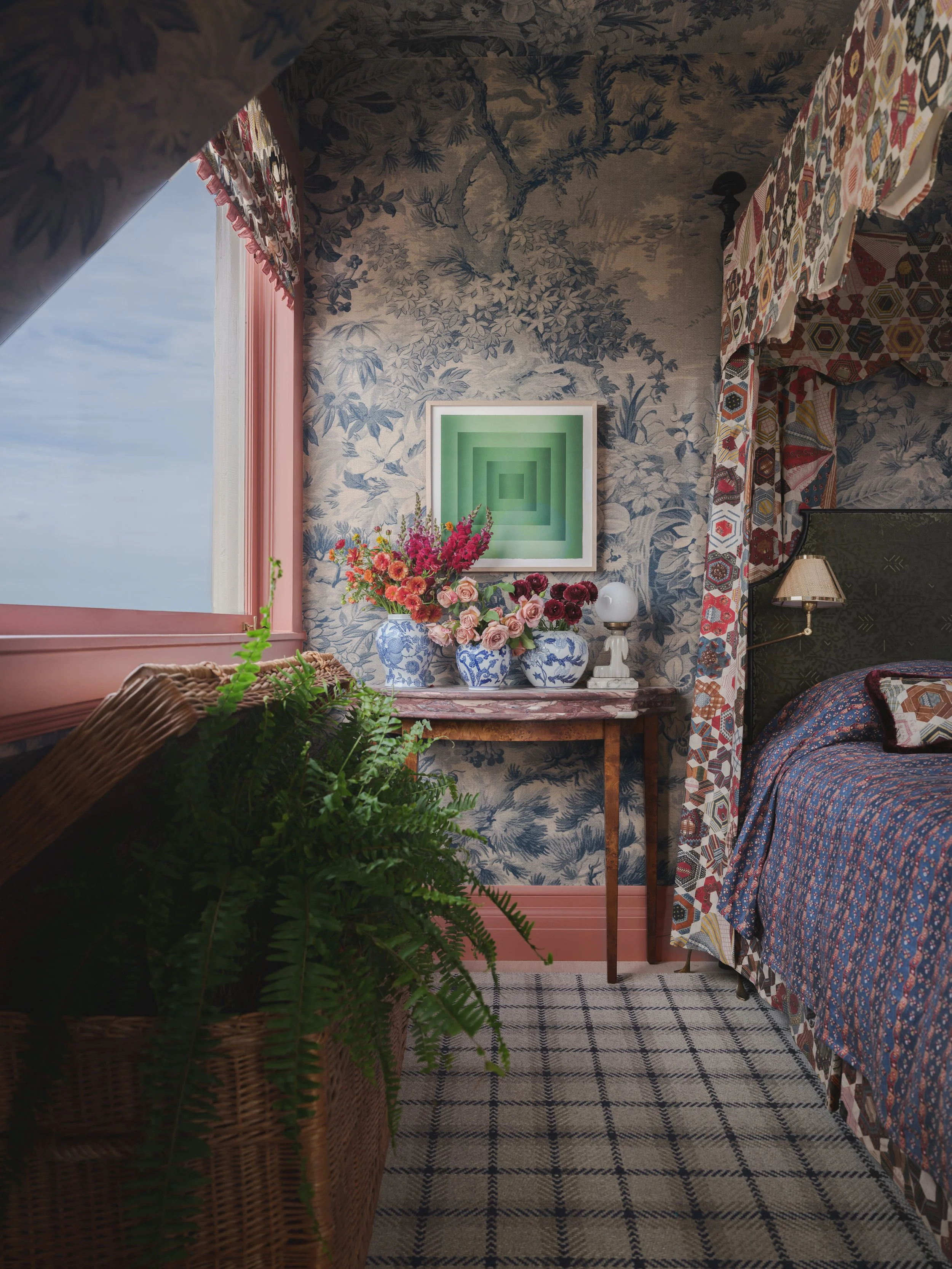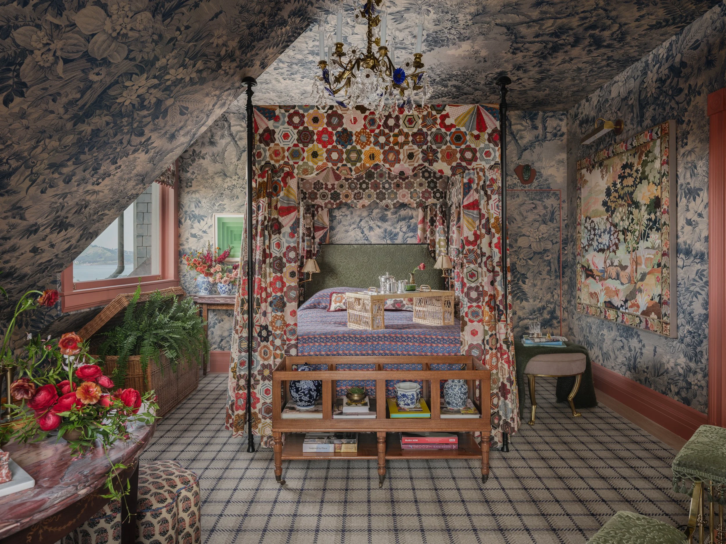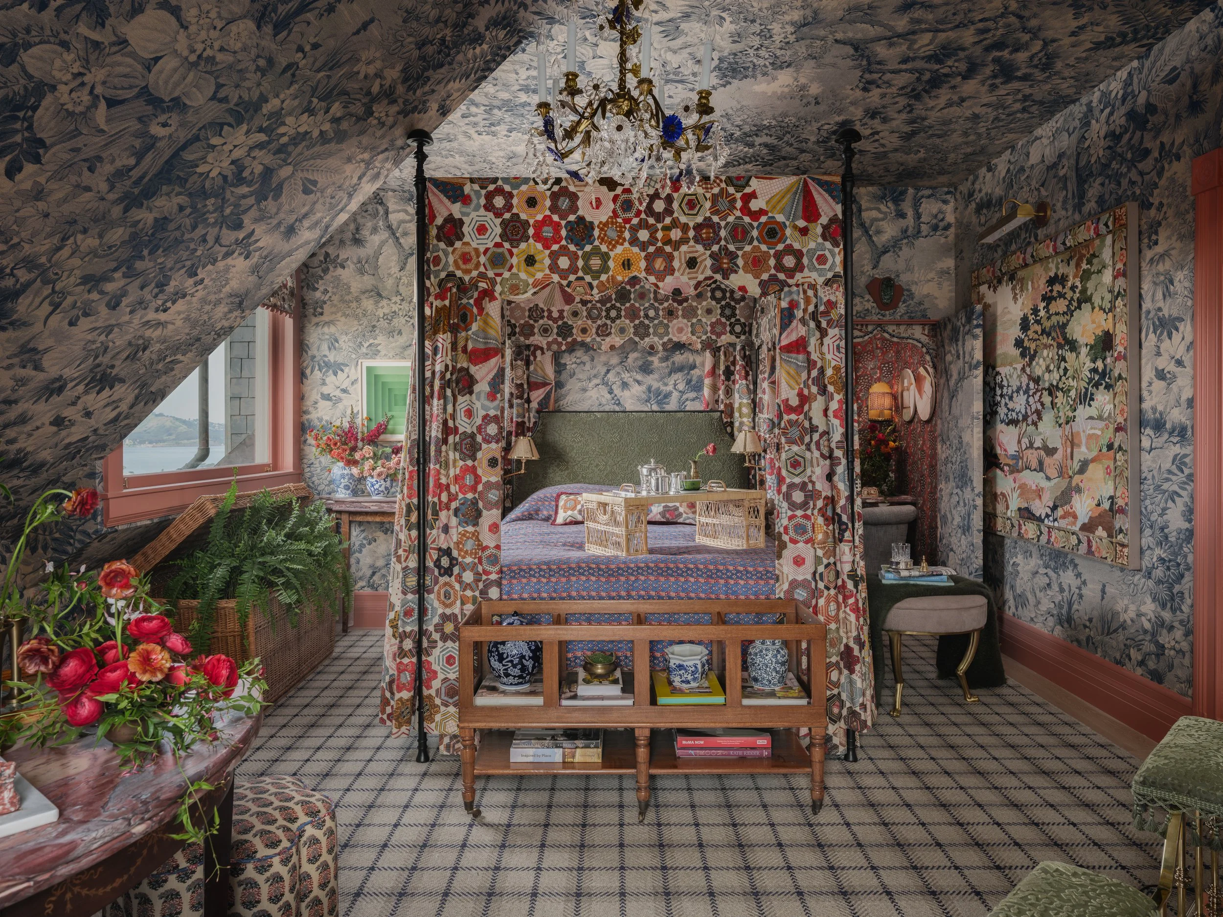 Floating high on the third floor with sweeping views of the San Francisco Bay, this bedroom and adjoining deck are imagined as a Parisian boutique hotel retreat, part Hideaway, part daydream. Inspired by the shifting palette of fog meeting ocean, a panoramic blue toile wraps, the space setting a serene, immersive tone that feels timeless and transportive. A tucked away makeup vanity revealed behind a hidden closet door creates an intimate getting ready ritual the perfect prelude to an evening out. Layered patterns and rich textiles exude a collected, well traveled sensibility, while warm red access glow like the sunset on the water. A canopy bed anchors the room with romance, inviting you to check in, exhale, and stay awhile. Room service, please