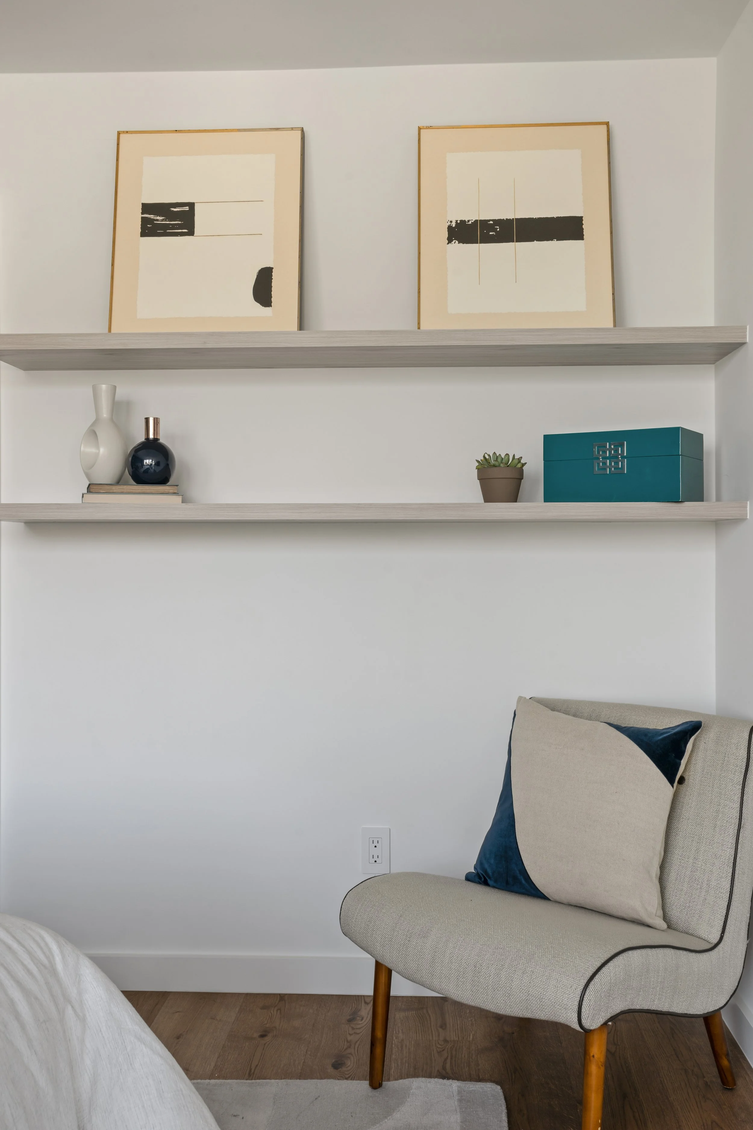 The staircase became the focal point of the home, showcasing an open, suspended-in-air design that serves as a piece of art and also functionally showcases their art pieces, tying all the floors together.